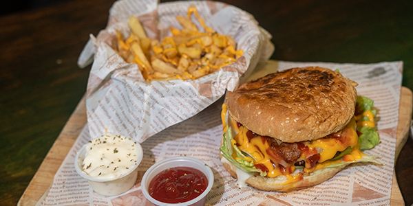 Doble carne de res, beicon, lechuga, tomate, cebolla, queso chédar, aderezos.